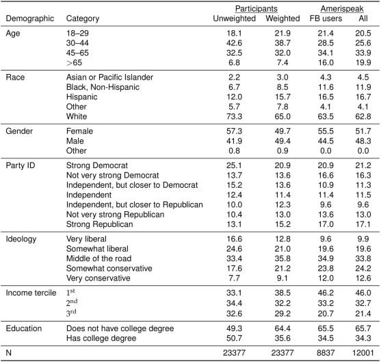 1. Demographics and political attitudes of study participants without survey weights applied (first column), study participants with survey weights created to reflect the population of adult monthly active Facebook users who were eligible for recruitment (second column), respondents who report using Facebook in an AmeriSpeak probability sample with survey weights applied (third column), and all respondents in the AmeriSpeak probability sample with survey weights applied (fourth column). See SI Section 4.5 for details on the sample.