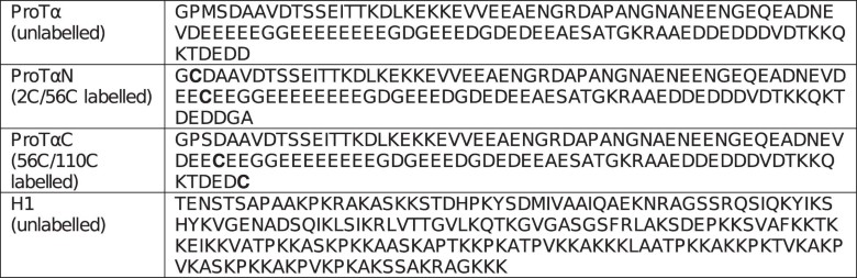 1. Cys residues introduced for labelling are indicated in bold. Unlabelled ProTα is a variant of human ProTα isoform 2, while ProTα 2C/56C and 56C/110C are variants of isoform 19,28. The isoforms differ by a single Glu at position 39.