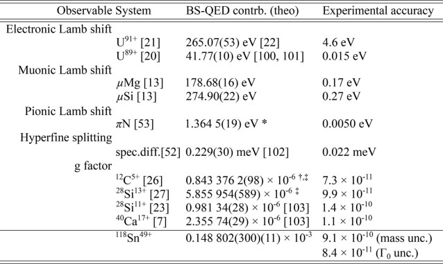1. Values for the data points in Fig. 4. (See refs. 100,101,102,103). *In this measurement, the pion mass is extracted from the experiment–theory comparison. To account for that in the QED test, the theoretical uncertainty is adjusted to the previous literature value of the charged pion mass. Similarly, this measurement is used to determine the electron mass such that a test of QED can only be as accurate as the accuracy of an independent electron-mass measurement. Recently, the electron mass has been confirmed with similar accuracy in HD+ spectroscopy104, allowing to (basically) use the full experimental precision for a test of QED. Calculated similar to the 118Sn49+ theory g factor as described in Methods.