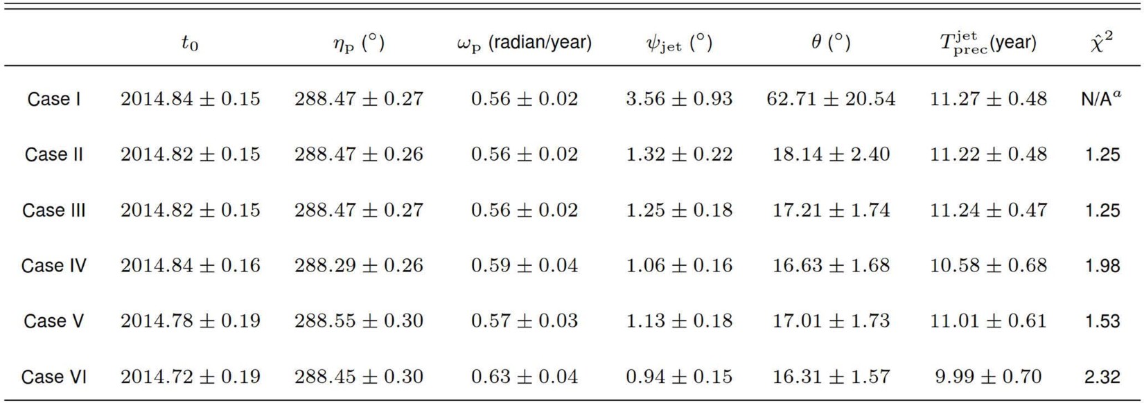 1. The last column is the reduced \({\widehat{\chi }}^{2}\) value calculated with the best-fit model parameters (see Equation (15)). We adopt Case III as the final fitting results as shown in Table 1. aFor Case I, \({\widehat{\chi }}^{2}\) is not applicable since there is a degeneracy between ψjet and θ. The values correspond to the means of the MCMC samples with standard deviations.