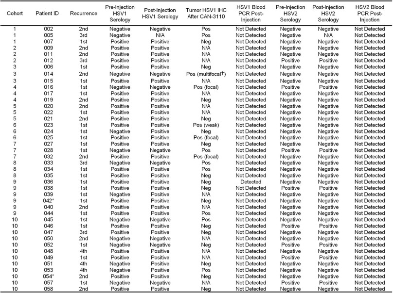 Extended Data Table 3 Number of HGG recurrences at time of CAN-3110 accrual/HSV1 and HSV2 serology and blood biodistribution