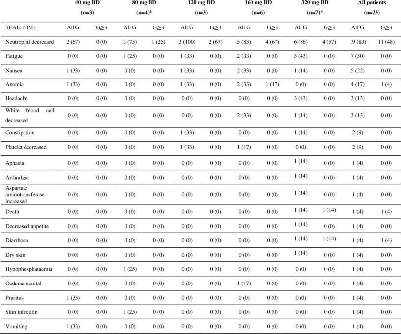 2. Data are n (%). Treatment-related adverse events of 23 patients were included the safety analysis.