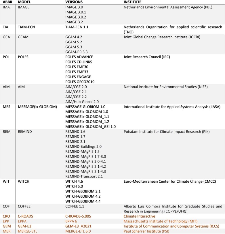 1. The table contains model abbreviations, versions that are merged in this analysis and the associated institute managing the model. Models colored in orange are excluded from this analysis because of their small abundance in the dataset. For more information on each model, the reader is referred to the Integrated Assessment Modelling Community (IAMC) wiki: https://www.iamcdocumentation.eu/index.php/IAMC_wiki.