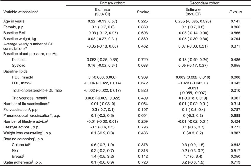 3. For age, colorectal screening and breast cancer screening, we assumed a quadratic relationship with baseline HbA1c.