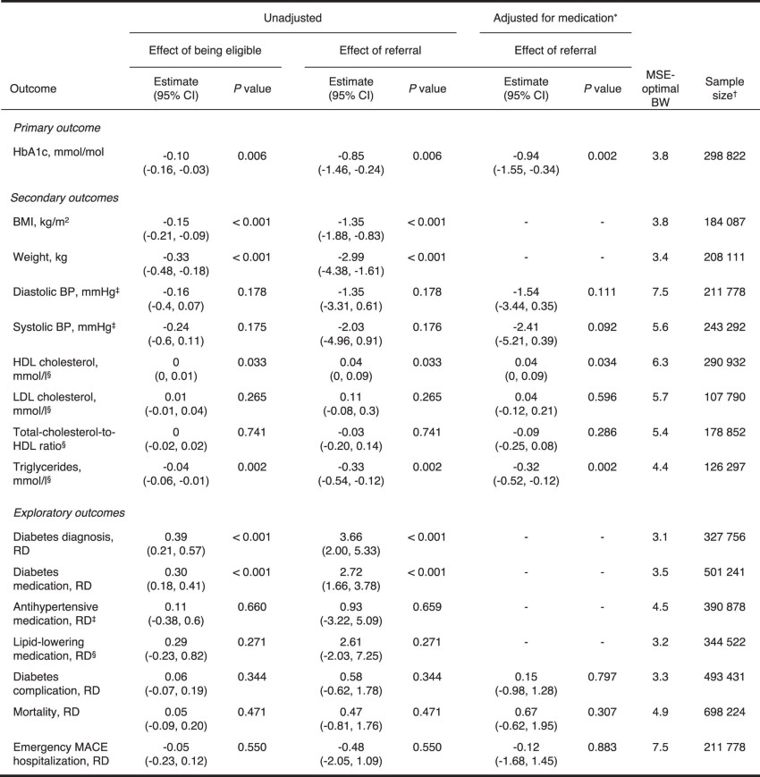 - BMI = Body mass index. BP = Blood pressure. MACE = Major adverse cardiovascular event. RD = Risk difference (i.e., difference in the probability of the outcome in percentage points). This table shows the main regression discontinuity results for the primary cohort including effect size estimate, 95% confidence intervals (95% CI), P values, mean-squared error (MSE) optimal bandwidth (BW) and sample size. The effects were estimated in local linear regressions with heteroskedasticity-robust standard errors and triangular kernel weight and evaluated using two-sided t-tests (p < 0.05). The definition of all outcomes is detailed in the Supplementary Information 1.2. Additional details are available in Methods (‘Main Analysis’). We compared statistical significance to results using robust bias-corrected confidence intervals, which yielded the same statistical inferences except for diabetes medication, which was no longer significant (Extended Data Table 4). Results for the secondary cohort are available in the Supplementary Information S4.