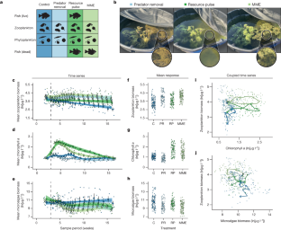 Chlorophyll-a (ln[μg/L], A-B), zooplankton biomass (ln[μg/L], C-D), and microalgae biomass (ln[μg/L], E-F) following predator mass mortality events (MMEs, light green), predator removals (light blue), and resource pulses (dark green), as well as the undisturbed system (control, dark blue). Points and lines indicate mean values and 95% CIs, with points jittered to reduce overlap. Raw data (A, C, E) were similar to smoothed data (B, D, F, as in Fig. 1f–h). Specifically, relative to the experimental control, predator removals decreased average chlorophyll-a (F1,14 = 5.50, p = 0.03; A), resource pulses increased average chlorophyll-a (F1,14 = 151.48, p < 0.01), and there was no significant interaction between predator removals and resource pulses (i.e., MMEs) on chlorophyll-a (F1,14 = 0.26, p = 0.62). Additionally, predator removals increased zooplankton biomass (F1,14 = 5.03, p = 0.04; C), but there was no effect of resource pulses on zooplankton biomass (F1,14 = 0.56, p = 0.47) nor was there a significant interaction between predator removals and resource pulses on zooplankton biomass (F1,14 = 0.07, p = 0.80). Lastly, there was strong evidence that predator removals reduced microalgae biomass (F1,14 = 4.16, p = 0.06; E), but there was no effect of resource pulses on microalgae biomass (F1,14 = 0.64, p = 0.43) nor was there a significant interaction between predator removals and resource pulses on microalgae biomass (F1,14 = 0.01, p = 0.94). Results for the analysis of the smoothed data are shown in the main text. Raw data were analysed from 391 biologically independent samples for a control (n = 106), predator removal (n = 88), resource pulse (n = 88), and MME (n = 109). Smoothed data were analysed from 355 biologically independent samples for a control (n = 96), predator removal (n = 80), resource pulse (n = 80), and MME (n = 99), from one experiment. Two-way, two-sided ANOVA (A-B).