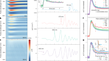 Then, we explain the optical properties of band-edge excitons, spectrally identifying excitons and biexcitons in weakly confined QDs. At high excitation fluence (0.85 μJ cm−2), the photoluminescence spectrum acquired with high spectral resolution (0.3 meV) features several emission peak manifolds that are assigned to the fine structure of exciton and biexciton, at high and low emission energies, respectively (Fig. 5a, dark solid line). To confirm this attribution, we measured the polarization of exciton and biexciton fine structures. As shown in Fig. 5a, exciton (X) and biexciton (XX) triplets were observed with a fine structure splitting (∆FFS = ((E2 − E1) + (E3 − E2))/2) of around 1.06 meV for both species. The triplet sublevels are denoted as H, V and O, respectively, representing their individual polarization orientation. Figure 5b shows the spectrally and polarization-resolved detection of each sublevel for both the biexciton (transitions |XX⟩ to |X⟩) and exciton (transitions |X⟩ to |G⟩), showing a mirror-symmetric correlation in intensities of the sublevels with respect to the linear polarizer angles. This can further be shown by the integrated intensity of each sublevel of the exciton and biexciton triplet, plotted as a function of the polarizer angle in Fig. 5c. Each sublevel possesses a linear polarization profile, attested by the agreement with a sin2 function (fitted grey line), with crossed polarization orientations, in agreement with previous findings11,13,44,45,46. Moreover, the total energy and polarization preserves for each set of biexciton–exciton peaks as a result of the two-photon cascade decay from the biexciton state (with zero angular momentum) through the exciton state to the ground state46,47,48. All these experiments show that radiative speed-up can be achieved in a quantum system with discrete energy levels in all dimensions.