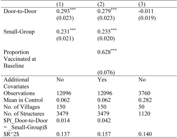 1. The table presents Intent-To-Treat estimates of the adult vaccination rate. Column 1 presents the adult vaccination rate for the sub-treatment arms. Treatment effects are estimated using OLS and include randomization block fixed effects (triplets) and heteroscedasticity-robust standard errors clustered at the village level. Column 2 adds covariates that were imbalanced at baseline. Column 3 presents the results of the individual Door-to-Door campaign where up to 20 structures were randomly assigned to be visited by the social mobilization team. The sample is restricted to the 50 villages assigned to the Door-to-Door treatment arm, and non-peripheral structures within these villages. Treatment effects are estimated using OLS including randomization block fixed effects (villages), with heteroscedasticity-robust standard errors clustered at the structure (hut, house) level. The p-value in the bottom panel is from a two-sided t-test on the quality of means of both treatment arms. ***, **, and * indicate significance at the 1, 5, and 10 percent critical level and refer to two-sided tests without multiple comparison adjustments.