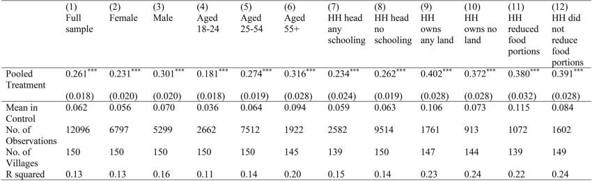 1. This table presents Intent-To-Treat estimates of the pooled treatment for demographic sub-groups included in Fig. 5. Treatment effects are estimated using OLS including randomization fixed effects (ie for each triplet) and heteroscedasticity-robust standard errors clustered at the community level. Dependent variable is the vaccination status at the end of the study of adults enumerated during the census. ***, **, and * indicate significance at the 1, 5, and 10 percent critical level and refer to two-sided tests without multiple comparison adjustments.