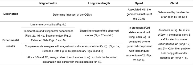 1. CGMs are characterized by their specific gaps (‘masses’), spin-2 and chiral properties. In this table, we show that the experimental results capture these key elements. CFs, composite fermions.
