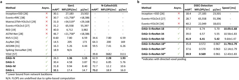 1. (a) Comparison against asynchronous methods in terms of computational complexity, task performance, and energy consumption. Results of event-based methods on the Gen1 detection dataset41 and N-Caltech10142. (b) Comparison of event and image-based detectors on DSEC-Detection. Here, methods are tasked to predict labels 50 ms after the first image, given a single image, and events. Speed refers to the average runtime of event insertion into the GNN averaged over the dataset.