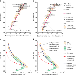 Area denotes ±1σ error. a, Colour-coded timeline of Endurance mission (as per Fig. 1a, Fig. 2a). b, Altitude versus time. c, Total Electron density (m−3). d, Electron temperature (K). e, Potential difference between Endurance and ambient plasma. The periodic (70 s) firing of the ACS thrusters (amber, panel a) temporarily perturbed the plasma environment around the spacecraft. The resulting erroneous measurements by SLP have been cut from the dataset.