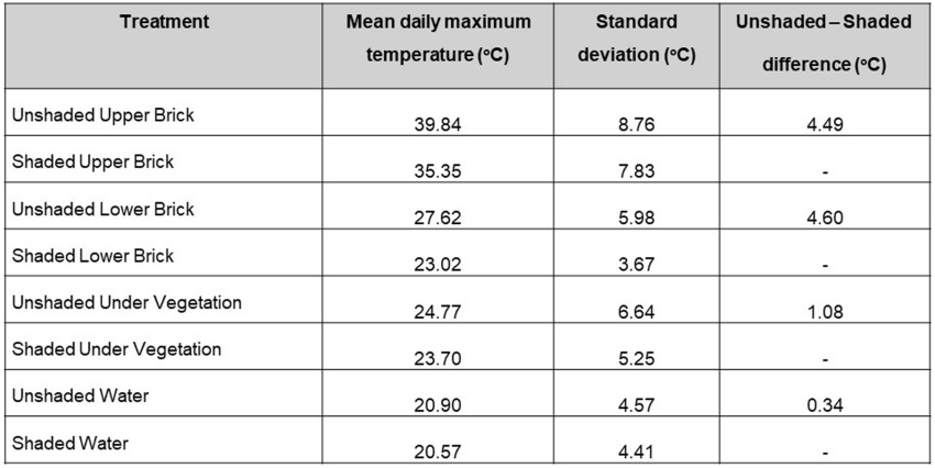 1. Mean maximum daily temperatures in unshaded greenhouse (n = 6) or shaded greenhouse (n = 6) treatments by location.