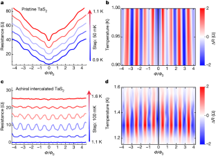 a,c, Four-terminal resistance (logarithmic scale) of two further achiral intercalated 2H–TaS2 Little–Parks devices as a function of magnetic field at different temperatures. b,d, Colour mapping of the Little–Parks oscillation amplitudes of achiral molecule intercalated devices as a function of temperature and external magnetic flux. No phase shift was observed among a total of four achiral molecule intercalated TaS2 devices that showed Little–Parks effect, highlighting the essential role of molecular chirality in achieving π-phase shift.