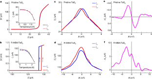 a, ΔIc versus magnetic field in chiral molecule intercalated TaS2. b, ΔIc versus field in chiral molecule intercalated TaS2, which can be resolved with a combination of odd (c) and even (d) function components. c, Phenomenological calculated field-mediated critical current differences ΔIc-odd as a function of magnetic field. d, Field-free diode component ΔIc-even as a function of magnetic field, which shows oscillation patterns (magenta). We note that there is an apparent oscillation with several peaks in the ΔIc-even versus B scan, with a Fraunhofer-like pattern. The overall amplitude of ΔIc-even decays more slowly with magnetic field than a typical Fraunhofer pattern (in which the peak amplitude scales with 1/B), but fits well with a non-uniform supercurrent distribution favouring an edge-state transport54,55,56. The dashed lines are fitting of a Fraunhofer pattern with uniform current distribution (red) or with edge current distribution (blue).
