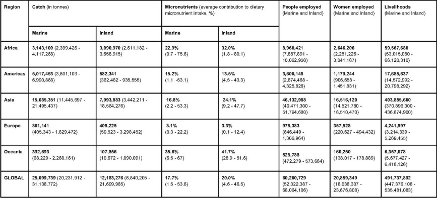 1. Global and regional contributions of marine and inland small-scale fisheries for catch, micronutrients, employment, livelihoods and women’s employment. Total and women’s employment include pre-harvest, harvest and post-harvest activities. Livelihoods include employed/subsistence fishers plus partial or fully dependent household members. In parentheses 95% confidence intervals are shown for catch, employment and livelihoods. Micronutrient values are the average contribution to dietary intake of six micronutrients (calcium, iron, selenium, zinc, omega-3 fatty acids, vitamin A) for coastal populations, where uncertainty is the lowest and highest value for individual micronutrients. Although fatty acids are not defined as micronutrients, because the RI (recommended intake) for omega-3 fatty acids that are concentrated in aquatic foods (EPA and DHA) is within the micronutrient range, here we refer collectively to all six nutrients as micronutrients.