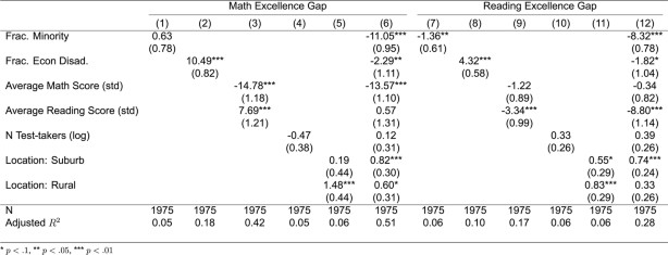 1. This table presents results of twelve OLS regressions to predict a school’s excellence gap with its observable characteristics. Positive values of the excellence gap are in favor of minorities. Observation is at the school-level, weighted by the number of test-takers in that school across all years. Each regression includes indicators for each grade that a school teaches, and year that the school is observed in the data for. Excellence is defined as reaching the top decile on the math or reading statewide standardized exam, MEAP for all years until 2014 and M-STEP for all years after 2014. Analysis uses our main sample, as defined in Methods, which consists of 534,122 students in total: 136,137 classified as a racial minority and 397,985 as a non-minority. Standard errors in parentheses, clustered at the school-level. All tests are two-sided.