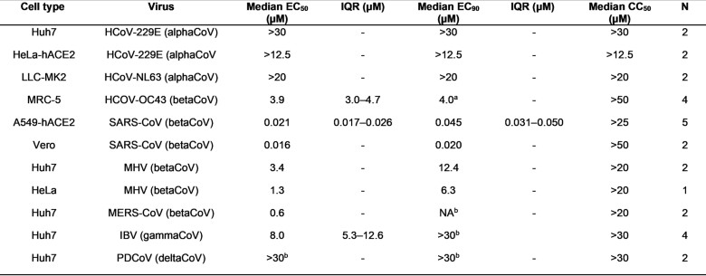 1. CC50, 50% cytotoxic concentration; CoV, coronavirus; ECx, x% effective concentration; IBV, infectious bronchitis virus; IQR, interquartile range; MERS-CoV, Middle East respiratory syndrome coronavirus; MHV, mouse hepatitis virus; N, number of independent technical repeats; NA, not available; PDCoV, porcine deltacoronavirus; SARS-CoV, severe acute respiratory syndrome coronavirus.