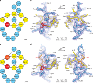 (a, b) Structure of ribosome-bound LAR is shown from two opposite sides, highlighting intramolecular H-bonds that stabilize its fold. Carbon atoms are colored yellow, nitrogens are blue, oxygens are red. (c, d) Superposition of the structures of ribosome-bound LAR and LAR-B. Residues whose positions differ between the two isoforms are labeled. Nitrogen and oxygen atoms in the isopeptide bonds are colored blue and red, respectively.