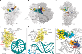 Data supporting the findings of this study are available within this paper and its Supplementary Information or have been deposited to the indicated databases. Coordinates and structure factors were deposited in the RCSB Protein Data Bank (PDB) with the following accession codes: 9DFC for the wild-type T. thermophilus 70S ribosome in complex with LAR, mRNA, aminoacylated A-site Phe-tRNAPhe, aminoacylated P-site fMet-tRNAiMet, and deacylated E-site tRNAPhe; 9DFD for the wild-type T. thermophilus 70S ribosome in complex with LAR-B, mRNA, aminoacylated A-site Phe-tRNAPhe, aminoacylated P-site fMet-tRNAiMet, deacylated E-site tRNAPhe; and 9DFE for the wild-type T. thermophilus 70S ribosome in complex with LAR and protein Y. All previously published structures used in this work for structural comparisons were retrieved from the RCSB Protein Data Bank: PDB entries 6XHW, 6XHX, 6CAE, 4G5K, 4YBB and 4W2I. The complete genome sequence of Paenibacillus sp. M2 is available in NCBI GenBank under accession no. CP169648. Phylogenetic tree and the DNA segments containing lrc-like BGC are available at https://github.com/jangrm1/LAR-BGC. Source data are provided with this paper.