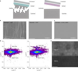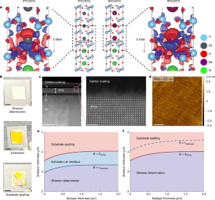 a,b, Optical images (a) and EBSD maps (b) of exfoliated Pb-containing membrane with a size of 5 × 5 mm2, confirming high uniformity and maintained single crystallinity. c, Rocking curve of as-grown Pb-containing epilayers on different substrates. An FWHM ranging between 0.016° to 0.090° indicates good crystallinity of all epilayers. d,e, Optical images (d) and plan-view SEM (e) showing the surfaces of non-Pb-containing materials including BTO (left) and SRO (right) with spalled STO substrate layers. f, Peeling modes of heterostructure with different lattice mismatch. Exfoliation of Pb-containing materials occurs with lattice mismatches ranging from 2.9% to 0.026%. While non-Pb-containing materials with the same lattice mismatch shows spalling results, thus clearly substantiating the universal effect of Pb-related interface weakening. NSOa and NSOb refer to the two anisotropic in-plane pseudocubic lattice parameters of the NSO substrate.