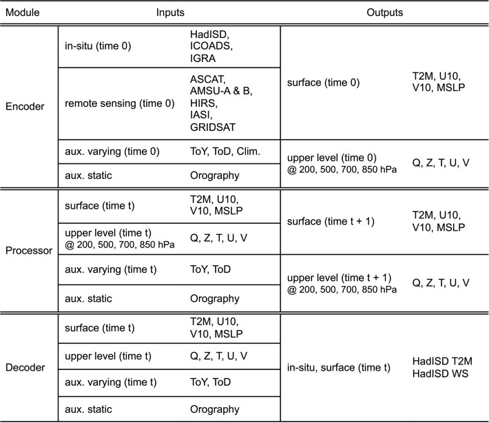 1. Raw data are passed to the encoder module which outputs predictions of the 24 prognostic variables on a global 1.50° grid at t = 0. This initial state is then input to the processor module to produce predictions for each of the prognostic variables at lead times of one to ten days on the same grid. Finally, the decoder module takes these global predictions to local predictions at station locations.