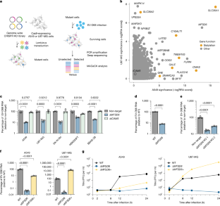 Dataset of U87-MG EV-D68 CRISPR screens. Genome-scale CRISPR screen datasets were analysed using the MAGeCK algorithm. P values are calculated using MAGeCK. P values are one-sided. FDR-adjusted P values were multiple-hypothesis corrected using the Benjamini–Hochberg procedure.
