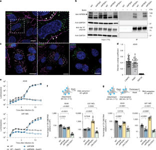 (a) RNA expression of MFSD6 from Human Protein Atlas80,81 using the GTEx dataset. nTPM is the normalized protein-coding transcripts per million. (b) Percentage of edited DNA harvested from pooled knockouts (KOs). Analysis was done with CRISPResso2. (c) Detection of MFSD6 by western blot in A549 cells (top) and U87-MG cells (bottom) using an endogenous MFSD6 antibody. The black triangle points to MFSD6. (d) Representative immunofluorescence images, zoomed in, from two independent experiments for A549 wild-type (left), A549 ΔMFSD6 cells (middle left), U87-MG wild-type (middle right), and U87-MG ΔMFSD6 cells (right) infected with EV-D68 (MOI = 5) for 24 h and stained for EV-D68 VP1 (green). Nuclei are labelled with Hoechst (blue). Percentages indicate the mean with s.e.m. (n = 5 images). Over 500 cells were imaged for each condition. Scale bar, 25 μm.