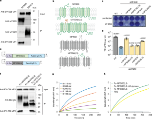 (a) Western blot for MFSD6 and MFSD8 in A549 wild-type, ΔMFSD6, ΔMFSD6+ , ΔMFSD6 + MFSD6ΔL3, MFSD6 + MFSD8, ΔMFSD6 + MFSD8(LS), and ΔMFSD6 + MFSD6-mNeon cells. The black triangle indicates MFSD6 or MFSD8. (b) Coomassie stain of purified Fc constructs (left) and purified EV-D68 (right). (c) Western blot of immunoprecipitation (IP) of Fc-MFSD6(L3) and Fc-MFSD8(L9) with EV-D68 or EV-A71. (d) Biolayer interferometry (BLI) assay. The biosensor was coupled with Fc-MFSD6(L3) (green), Fc-MFSD8(L9) (grey), or PBS (blue) and binding with 2 * 109 PFU ml−1 CVB3 was determined. Fc constructs were loaded at 0.2 μg μl−1 and reached saturation. (e) Gradient banding pattern from 10–50% (w/v) iodixanol gradient and corresponding fractions taken for (f) western blotting against EV-D68 viral capsid proteins and plaque assay (g). Fractions I and J contained bands corresponding to the mature virus, which were combined and used for cryo-EM, with representative micrographs shown for (h) apo EV-D68 (from 10,400 micrographs) and (i) EV-D68 bound to Fc-MFSD6(L3) (from 11,869 micrographs). Scale bars, 20 nm.