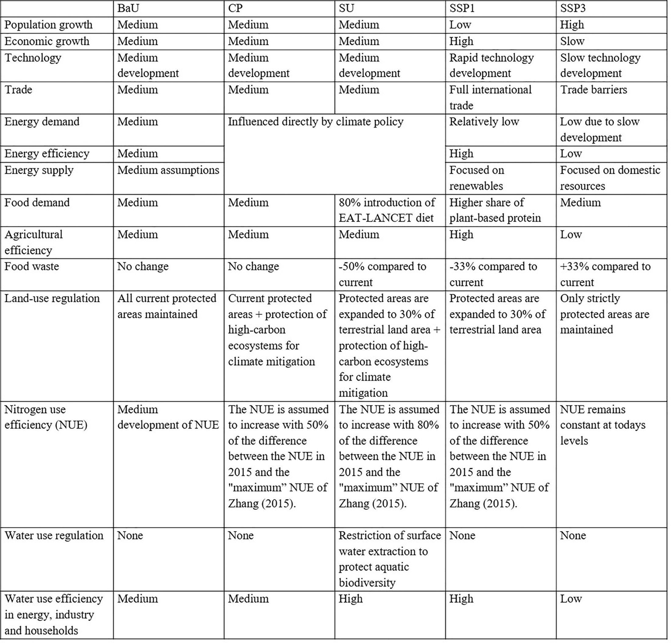 1. Qualitative description of the main assumptions for each scenario that are translated into the quantitative model input. Many key input and output are included in the supplementary information.
