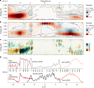 a,b, Transient reflection spectrum as a function of carrier density (n) and probe photon energy E (ħω2) at pump–probe delays of device D1 Δt = 300 ps, with the dashed boxes indicating the integration range for the exciton (black) and trion (blue) shown in Fig. 1g (a) and device D2 Δt = 450 ps, with the dashed boxes indicating the integration range for the exciton (black), trion (blue) and trion derivative (red) shown in Fig. 2d (b); trion D2 1.107–1.114 eV, exciton 1.130–1.122 eV, derivative 1.115–1.106 eV; D1: trion electron doping 1.108–1.114 eV, exciton electron doping 1.120–1.125 eV, exciton hole doping 1.126–1.123 eV, trion hole doping: 1.112–1.117 eV.