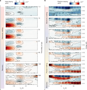 a, Time profiles of all of the electron doping states in D1. b, Electronic melting and recovery time constant of all of the electron-doped states. c, Phonon melting and recovery time constant of electron-doped states. d, Time profiles of hole-doped states. e, Electronic melting and recovery time constant of all of the hole-doped states. f, Time profiles of ν = 0, 1/3 and 1/2. Data normalized to t = 0 ps. g, Time profile difference of ν = 1/3 and 1/2 to ν = 0. All data obtained at a temperature of T = 2 K, with no external electric or magnetic field.
