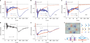a, Optical image (approximately 100 µm × 100 µm) of device D3. b, PL spectra as a function doping level (estimated from calculated capacitance). The left and right panels show displacements fields of D = 0 and −0.02 V nm−1; the latter is used to compensate for a small build-in potential. c–e, Transient reflection spectrum as a function of total gate voltage Vg (V) and probe photon energy E (ħω2) at pump–probe delays of Δt = 7 ps (c), Δt = 13 ps (d) and Δt = 500 ps (e). The pump (0.99 eV) and probe fluences are at 42 µJ cm−2 and 22 µJ cm−2, respectively. Sample temperature T = 1.6 K. There is no external magnetic field (B = 0) or displacement field (D = 0). The gate voltage ranges in c–e correspond to the same estimated doping range shown in the PL maps in b. No specific states (at particular Vg or doping levels) are resolved in the pump–probe spectral maps at all three selected Δt values (7, 13 and 500 ps), in agreement with the PL maps in b. The transient spectral maps feature exciton and trion resonances, with energy splitting in certain doping ranges; these splitting features have been observed before and are attributed to exciton/trion fine structures in MoTe2 monolayers44,45 and/or exciton polarons in tMoTe2 bilayers46. The broad contrasts in exciton/trion ΔR/R signal vary slowly with Δt and probably result from the dynamics or hot-carrier relaxation, carrier-phonon scattering, phonon cooling and balances in exciton and trion populations.