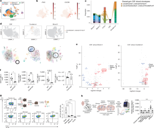 a, Degree of TCR clonal expansion from T cell clones in the human single-cell RNA-seq dataset (CSF, blood 1 and 2, colon, duodenum) was analysed using ScRepertoire. Inverse Simpson Index, Chao Index, and Inverse Pielou Index applied to TCR clonal expansion. **P < 0.01, ***P < 0.001 and ****P < 0.0001 by one-way ANOVA (n = 5) b, Highlighted the T cells with shared TCR clone between CSF, colon and blood in each tissue’s UMAP graph. c, Volcano plot of DEGs after comparing clusters containing the shared TCR clone from each tissue (colon vs blood 2 and colon vs CSF). d, Trajectory analysis on mouse single-cell RNA-seq dataset from Extended Data Fig. 5 to identify genes highly expressed in brain T cells along the Slingshot pseudotime trajectory. e, FACS analysis on CXCR6-deficient mice for IFNγ and IL-17A-secreting CD4 T cells in the brain, white fat, and meninges and spleen. **P < 0.01 and ****P < 0.0001 by one-way ANOVA test (n = 3 per group) f, FACS analysis on IP10 (CXCL10)-deficient mice for total CD4 T cell numbers and proportion of CXCR3+IFNγ+ CD4 T cells in the brain. **P < 0.01 by unpaired t-test (n = 5 per group, outliers were calculated using Grubbs’ outlier test and excluded).
