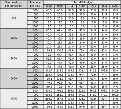 Extended Data Table 2 Optimal scan time to maximize prediction accuracy given different overhead costs per participant, scan costs per hour and total fMRI budgets