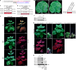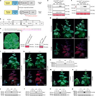 a, T1 transgenic HA-PCSTEV-PCSPVY-aAtNRG1.1 plants from line 3 showed no abnormal development. b, Transgene and its protein expression were detected by genomic PCR and immunoblotting in three independent individual T1 plants of line 3. c, d, The inoculated leaves of T1 transgenic HA-PCSTEV-PCSPVY-aAtNRG1.1 plants were photographed under normal light and UV light at 7 days post infection with PVY-GFP (c) and TEV-GFP (d). Bar is 2 cm.