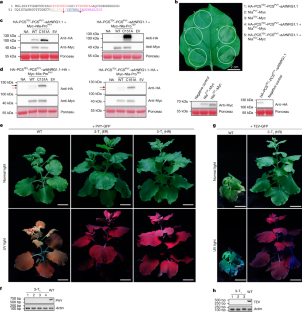 a, NIaPVY-Myc caused cell death in the leaf of T0 transgenic HA-PCSPVY-aAtNRG1.1 plants. b, T1 transgenic plants of line 1 grew and developed normally. c, Transgene and HA-PCSPVY-aAtNRG1.1 protein were detected by genomic PCR and immunoblotting in three independent individuals of T1 plants of transgenic line 1.