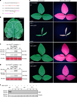 a, The inoculated leaves and whole plants were photographed under normal light and UV light at 7 and 21 dpi respectively. b, The enlarged view of top tissues accompanied with SHR at 21 dpi. c, RT-PCR showed that small amount of TEV RNA was detected in the systemic leaves of SHR plants.