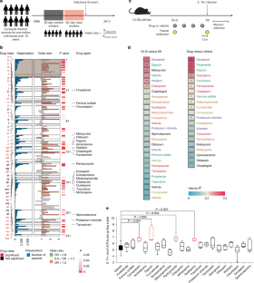 a, Details of the epidemiology study design. Examples of drug exposures that are included or excluded from case or control windows are shown. b, Table showing infection risk odds ratio for digoxin is comparable to the odds ratio measured for drug classes and individual drugs expected to increase infection risk. c, PCoA of Bray–Curtis distances between 16S rRNA-seq results from faecal samples from C57BL/6NTac mice before (red) and after treatment (blue). The ellipses in each PCoA plot depicts the 68% confidence marginal relationships among variables in each group generated by an integrated function in the R package “ggplot2”. Each point within the same colour represents an individual mouse. d, Area under the curve (AUC) comparison for growth of representative bacterial taxa under increasing drug concentrations (20, 40, and 80 µM). The tree represents the clustering of taxa based on growth inhibition profiles across all tested drugs. Colour shading represents normalized growth (AUC relative to DMSO control) (n = 3 independent biological replicates/drug). Two-sided Mann–Whitney tests were conducted to test the significance of AUC differences, and P values were corrected by the Benjamini–Hochberg method. Exact P values are provided in the Source Data. * P < 0.05, ** P < 0.01.