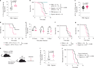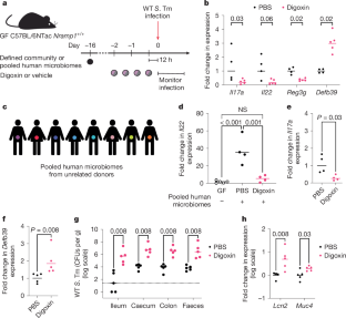 a,b, Characterization of recipient mice after transplantation of gut microbiomes from donor C57BL/6NTac mice treated with digoxin or PBS for 2 days. Gene expression in ileal tissue of recipient mice (PBS n = 4, digoxin n = 3) as measured by qRT–PCR (a) and weight of recipient mice after infection with S. Tm ∆invA (n = 9 per group) (b). c,d, Characterization of recipient mice after transplantation of gut microbiomes from donor C57BL/6NTac mice treated with digoxin or PBS for 7 days. Weight of recipient mice (n = 5 per group) after infection with S. Tm ∆invA (c), and survival of recipient mice after infection with S. Tm ∆invA (d). e–g, Characterization of recipient mice (n = 5 per group) after transplantation of gut microbiomes from donor C57BL/6J mice treated with digoxin or PBS for 2 days. Weight of recipient mice after infection with S. Tm ∆invA (e), pathogen burden in faeces collected from recipient mice at 4 dpi (f) and survival of recipient mice after infection with S. Tm ∆invA (g). In a, fold change is measured relative to the mouse housekeeping gene, Gapdh. In a–c,e,f, a two-sided Mann–Whitney test is used to compare two groups. For survival analysis, the Gehan–Breslow–Wilcoxon test is used. Bar represents geometric mean in a, median in f and s.e.m. in b,c,e. ns, not significant.