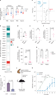 a–c, CV C57BL/6NTac mice (n = 5 per group) were treated with PBS or dihydrodigoxin (5 mg/kg) (standard regimen). 12 h after the final buffer or drug treatment, mice were infected with ~108 CFUs of S. Tm ΔinvA and infection monitored over time. a, Relative abundance of SFB, normalized to total bacteria, in faecal samples before and after PBS or dihydrodigoxin treatment. b, Pathogen burden at 12 h after infection. c, Survival curve. d, GF C57BL/6NTac Nramp1+/+ mice were colonized with a TH17-inducing defined community, pretreated with PBS (n = 4) or digoxin (n = 5) as in Fig. 1c, euthanized at D0, and ileal expression of select chemokine marker genes was measured relative to Gapdh expression. e, Estimation of cgr2 gene abundance across 29 faecal communities from unrelated human donors, as measured from metagenomic sequencing and ShortBRED analysis or targeted qPCR analysis. f, GF C57BL/6NTac Nramp1+/+ mice (n = 5 per group) colonized with a pooled human community were pretreated with PBS or digoxin as in Fig. 1c, euthanized at d0, and the ileal expression of select marker genes was measured relative to Gapdh expression. g, Volcano plot showing differentially abundant taxa in PBS- or digoxin-pretreated C57BL/6NTac Nramp1+/+ mice colonized with the pooled human-microbiome community. Statistics were performed using a two-sided Welch’s t-test. A P value cut-off of 0.01 was used to identify enriched/depleted taxa without adjustments for multiple comparisons. In a,b,d,f, a two-sided Mann–Whitney test was used to compare the two groups. In c, the Gehan–Breslow–Wilcoxon test is used. Bar represents median values in a,b, and geometric mean in d,f. ns, not significant.