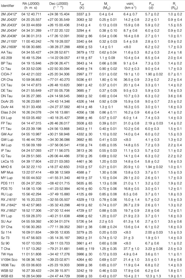 1. The stellar parameters shown in each column are the weighted mean of all relevant measurements found in the literature for each object. The compilation of effective temperatures, masses, vsini*, rotation periods, stellar radii, disk inclinations, associated literature references and the complete names of identifiers labelled with a ‘*’ are provided in the Supplementary Methods.