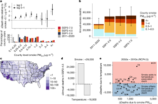 Wildfire activity has increased in the USA and is projected to accelerate under future climate change1,2,3. However, our understanding of the impacts of climate change on wildfire activity, smoke and health outcomes remains highly uncertain because of the difficulty of modelling the causal chain from climate to wildfire to air pollution and health. Here we quantify the mortality burden in the USA due to wildfire smoke fine particulate matter (PM2.5) under climate change. We construct an ensemble of statistical and machine learning models that link climate to wildfire smoke PM2.5 and empirically estimate smoke PM2.5–mortality relationships using data on all recorded deaths in the USA. We project that smoke PM2.5 could result in 71,420 excess deaths (95% confidence interval: 34,930–98,430) per year by 2050 under a high-warming scenario (shared socioeconomic pathway scenario 3-7.0, SSP3-7.0)—a 73% increase relative to the estimated 2011–2020 average annual excess deaths from smoke. Cumulative excess deaths from smoke PM2.5 could reach 1.9 million between 2026 and 2055. We find evidence for mortality impacts of smoke PM2.5 that last up to 3 years after exposure. When monetized, climate-driven smoke deaths result in economic damages that exceed existing estimates of climate-driven damages from all other causes combined in the USA4,5. Our research suggests that the health impacts of climate-driven wildfire smoke could be among the most important and costly consequences of a warming climate in the USA.