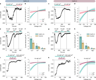 a, An example of I-V curve plot demonstrating the data processing method. The black curve represented the raw data obtained from a − 100 mV to +100 mV ramp protocol in 10 mM [Ca2+] solution. The gray curve represented the raw data obtained using the same ramp protocol in 0.02 mM [Ca2+] solution, and was defined as the background. The blue curve was obtained by subtracting the gray curve from the black curve, and was defined as the Ca2+ conductance. The same process was used to determine conductances for other ions as well. b, Expression of designs in Hi5 cells examined by western blot using an anti-His antibody. The four samples loaded on the gel (lanes indicated by the black bars) were whole-cell lysates of cells expressing CalC6_3 and CalC4_24, cells infected with the control virus (made from an empty pFastBac_Dual vector), and uninfected cells alone. c, The time course of currents at −100 mV in 10 mM [Ca2+] and 40 mM [Na+] extracellular solutions recorded on cells infected with the control virus. d, I-V relations obtained from a − 100 mV to +100 mV ramp protocol in 10 mM [Ca2+] (cyan) and 40 mM [Na+] (red) solutions, averaged over three separate cells infected with the control virus. The shaded regions represent bootstrapped 95% confidence intervals. e-h, Comparison of Ca2+ current densities elicited by the voltage step protocol in the 10 mM [Ca2+] extracellular solution between the designs and the negative control (without subtraction of background leak currents). e, The schematic illustration of the voltage step protocol (also shown in Fig. 3). f and g, Current densities obtained from the cells expressing CalC4_24 (f) and CalC6_3 (g). The source data are the same as those shown in Fig. 3e and f. Here, the currents are normalized by cell capacitances to obtain current densities. h, Current densities obtained from the cell treated with the control virus.
