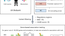 where m is the number of SNPs in the focal set of association, \({\hat{\beta }}_{jm}\) and \({\hat{\beta }}_{jc}\) the (winner’s curse corrected30,31) estimated marginal and conditional effect size of SNP j, respectively. For binary traits, we calculated \({\hat{h}}_{{\rm{G}}{\rm{W}}{\rm{A}}{\rm{S}}}^{2}\) as the proportion of liability variance explained by trait-associated variants using the R code provided in ref. 55 (‘Code availability’) with winner’s curse corrected effect sizes (on the observed scale), and allele frequencies and prevalence from the entire sample set. We calculated \({\hat{h}}_{{\rm{G}}{\rm{W}}{\rm{A}}{\rm{S}}}^{2}\) for CVA and RVAs separately then compared these quantities with their corresponding components of \({\hat{h}}_{{\rm{W}}{\rm{G}}{\rm{S}}}^{2}\) (Fig. 3a). We re-assessed \({\hat{h}}_{{\rm{G}}{\rm{W}}{\rm{A}}{\rm{S}}}^{2}\) for LDL, HDL and ALK in an independent sample of European ancestry participants of the AGD cohort as described in Supplementary Note 2.