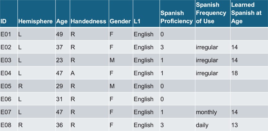 Extended Data Table 1 Spanish proficiency, frequency of use, and age of acquisition for self-reported English monolingual participants