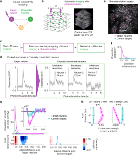 a, Example field of view showing the top imaged plane with responding target neurons (magenta) and non-responding neurons referred to as ‘control targets’ (cyan). b, Distribution of lateral distances between each control target and the closest neuronal target for all control targets. c, Bottom, causal ‘connection probability’ as a function of anatomical distance (lateral and axial) between all pairs of targets and causally connected neurons, shown for target neurons (magenta), all control targets (cyan). We also analyzed connection probability only for control targets that were intermingled with target neurons (within less than 25 µm laterally from target neurons, blue). Top, display the marginal distribution of the three bottom panels as a function of lateral distance; displayed as mean ± s.e.m. across sessions.
