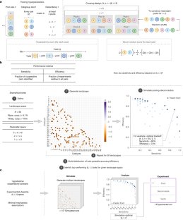 Cooperative catalysis, in which multiple catalytic units operate synergistically, underpins a variety of synthetically and mechanistically important organic reactions1,2,3,4. Despite its potential utility in new reactivity contexts, approaches to the discovery of cooperative catalysts have been limited, typically relying on serendipity or on previous knowledge of single-catalyst reactivity1,5. Systematic searches for unanticipated types of catalyst cooperativity must contend with vast combinatorial complexity and are therefore not undertaken6,7,8,9,10. Here we describe a pooling–deconvolution algorithm, inspired by group testing11, which identifies cooperative catalyst behaviours with low experimental cost while accommodating potential inhibitory effects between catalyst candidates. The workflow was validated first on simulated cooperativity data and then by experimentally identifying previously documented cooperativity between organocatalysts in an enantioselective oxetane-opening reaction. The workflow was then applied in a discovery context to a Pd-catalysed decarbonylative cross-coupling reaction, enabling the identification of several ligand pairs that promote the target transformation at substantially lower catalyst loading and temperature than previously reported with single-ligand systems.