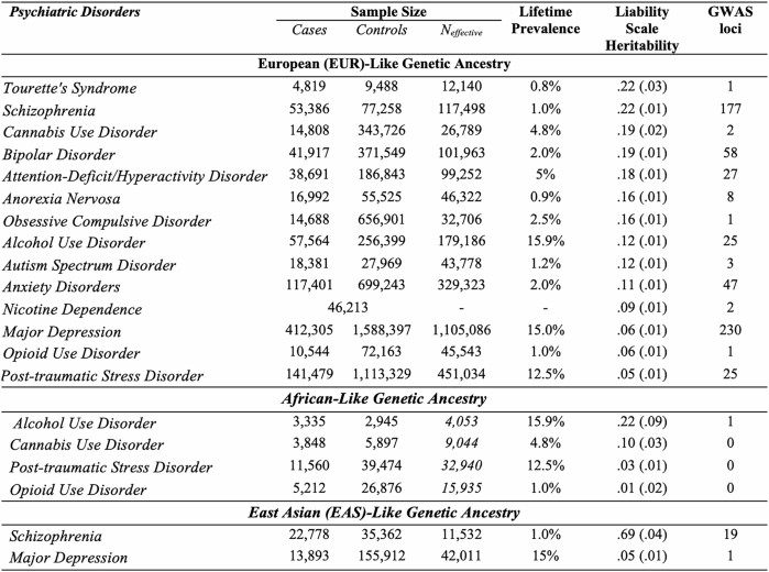 - The table is ordered with respect to the liability scale heritabilities (within each genetic ancestry). The Neffective column reports the sum of effective sample sizes across contributing cohorts. Nicotine dependence includes a single value for the sample size columns as this was the one continuous measure, defined using the Fagerström Test for Nicotine Dependence. The reported population prevalences were taken from the corresponding univariate publication when possible and were used for liability scale conversions (possible scale = 0–100%). The numbers in parentheses in the liability scale heritability column reflect the corresponding standard errors. The GWAS loci column reports the number of independent significant hits. A genome-wide significance threshold of P < 5 × 10−8 was employed to correct for multiple statistical comparisons, and significance was evaluated using two-sided P values obtained from Z-statistics, which reflected the estimated univariate GWAS beta over its estimated standard error. Results are shown for: Tourette’s Syndrome18, Schizophrenia17,30, Cannabis Use Disorder26, Bipolar Disorder13, Attention-Deficit/Hyperactivity Disorder15, Anorexia Nervosa14, Obsessive Compulsive Disorder19, Alcohol Use Disorder21,31, Autism Spectrum Disorder16, Anxiety Disorders22, Nicotine Dependence24, Major Depression20,29, Opioid Use Disorder25, and Post-traumatic Stress Disorder23.