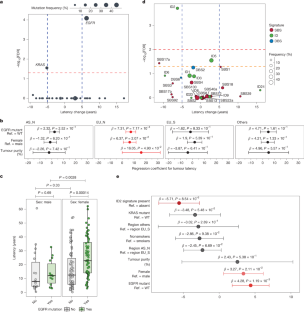 Extended Data Fig. 5 Associations between tumour latency and EGFR mutation status (a), KRAS mutation status (b) and sex (c), stratified by ancestry and tobacco smoking group.